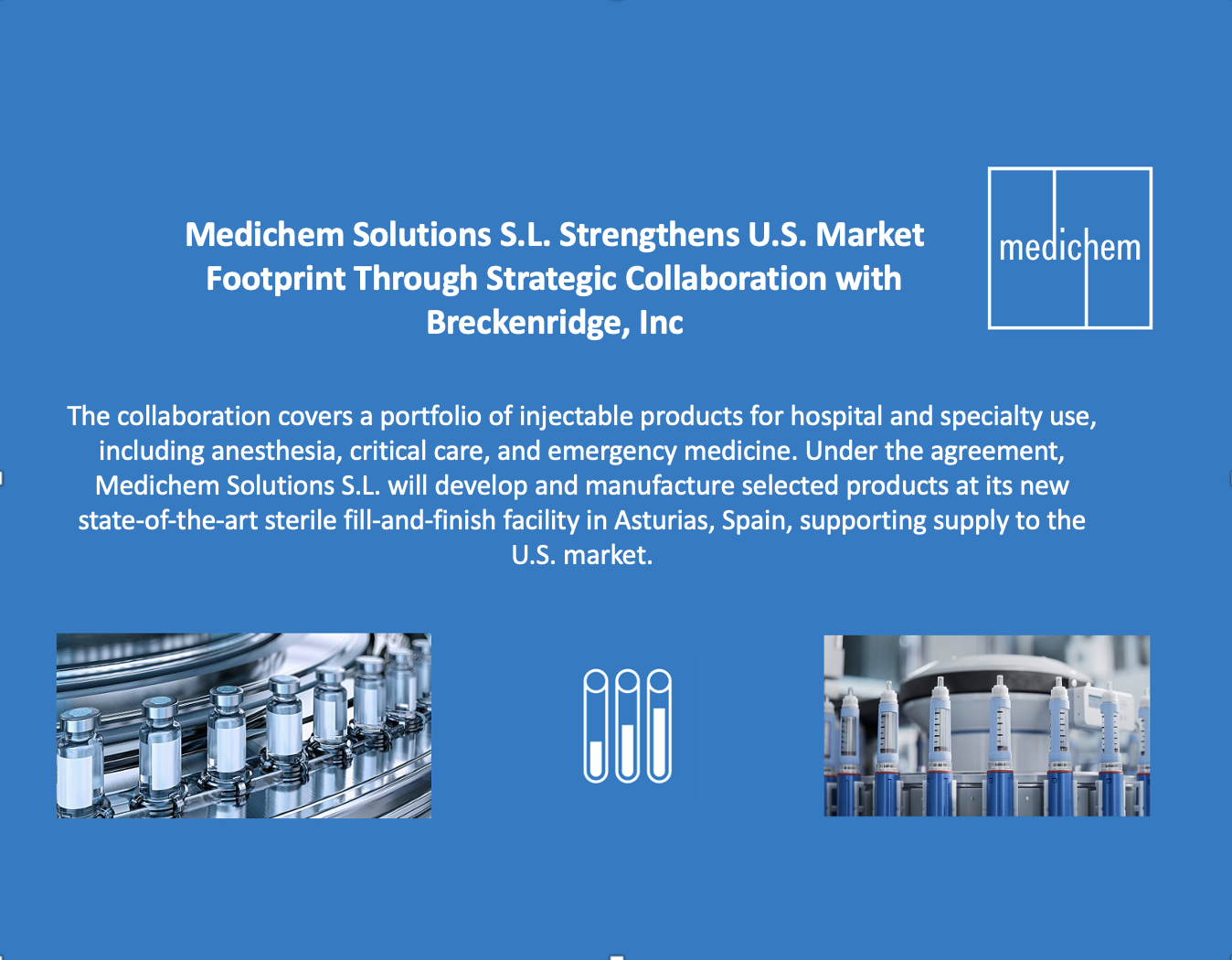 The collaboration covers a portfolio of injectable products for hospital and specialty use, including anesthesia, critical care, and emergency medicine. Under the agreement, Medichem Solutions S.L., Medichem’s wholly owned subsidiary, will develop and manufacture selected products at its new state-of-the-art sterile fill-and-finish facility in Asturias, Spain, supporting supply to the U.S. market.